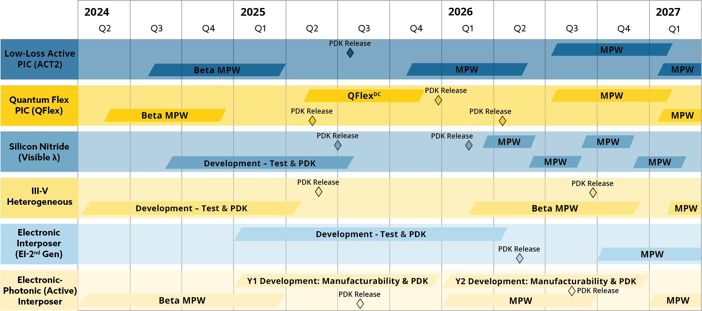 AIM Photonics members and customers have access to photonic integrated circuit (PIC) runs and emerging technologies, enabling rapid learning and prototype development in evolving application spaces. AIM Photonics continues to deploy quarterly multi-project wafer (MPW) runs, while incorporating new application-specific devices into its base MPW offerings. These new technology roll-outs are a result of the development of the internal capabilities roadmap.